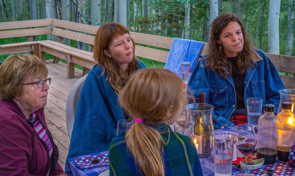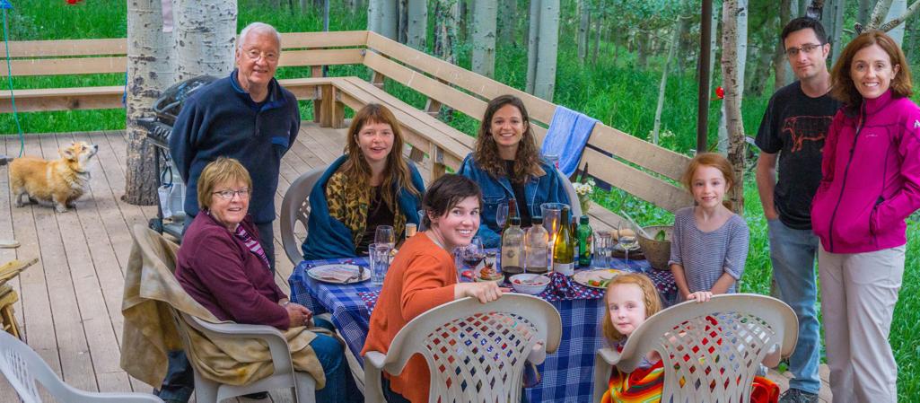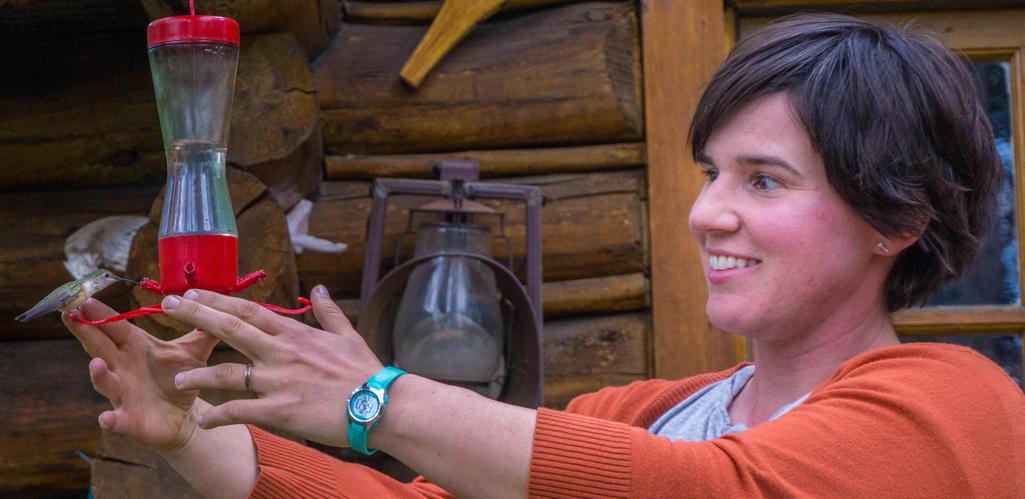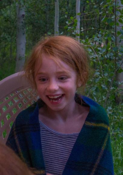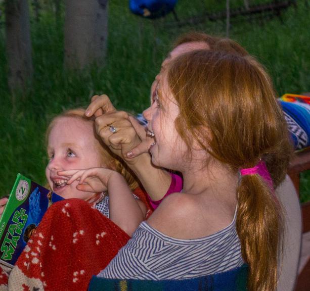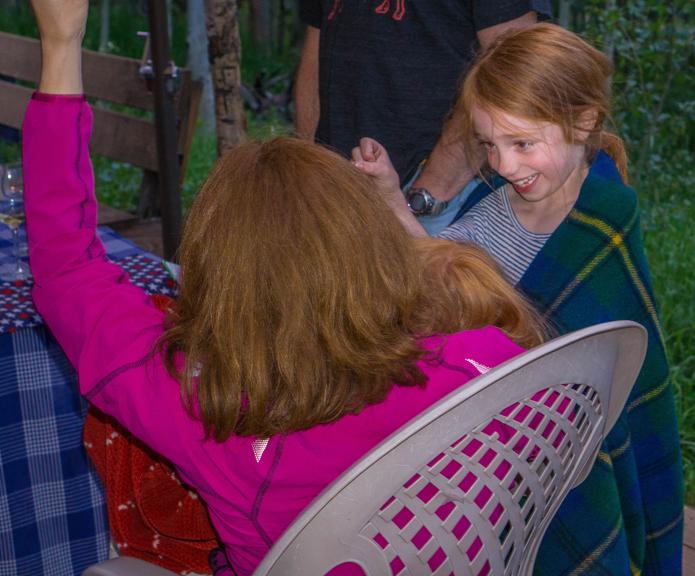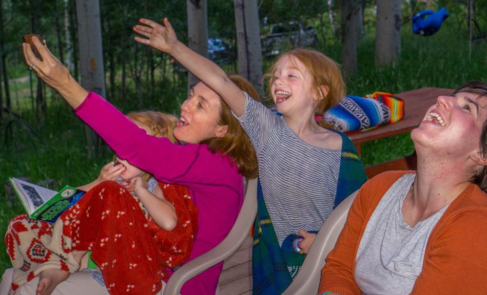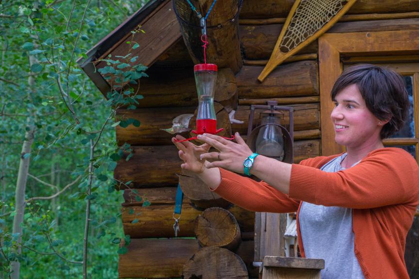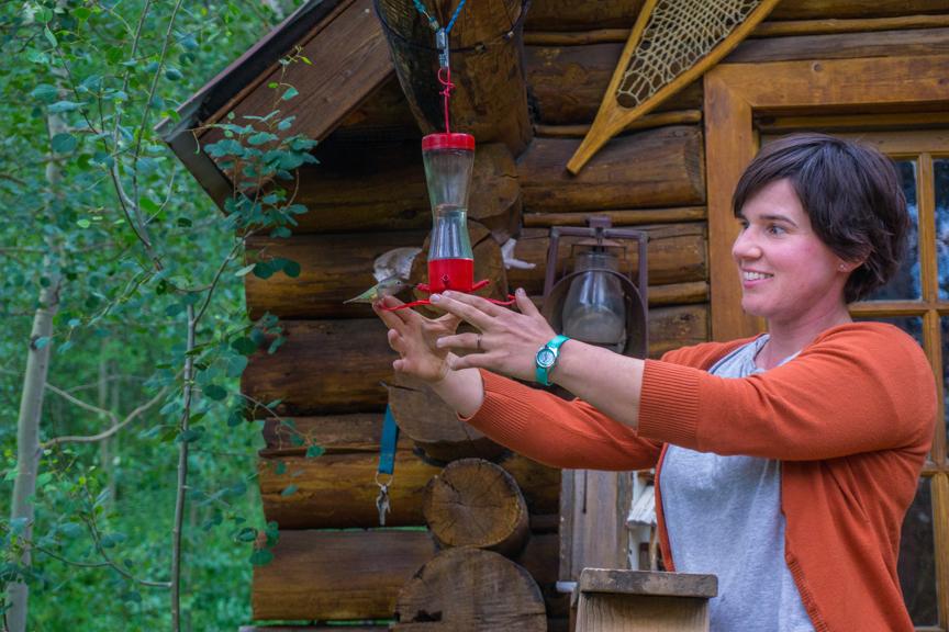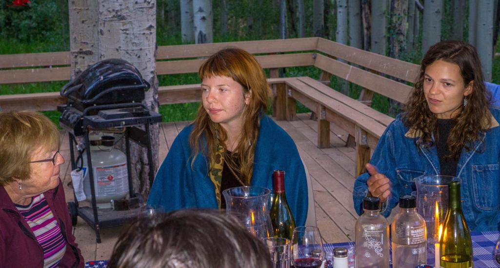 Karrie, Catherine, and Nikki - USFS Rangers - came to dinner, and tamed some broadtailed hummingbirds. Emmy, Michael, Thalia, and Matilda joined us for dessert.