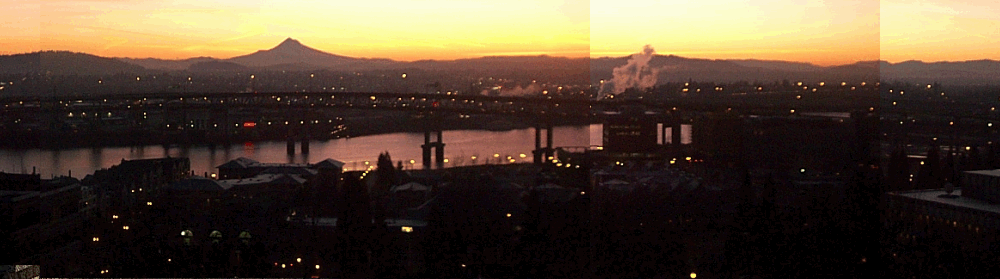 This is the view from my apartment at sunrise, and later in the day. It's at 222 SW Harrison, Portland, OR 97201 (503-499-6603). The mountain is Mt. Hood, the river the Willamette.