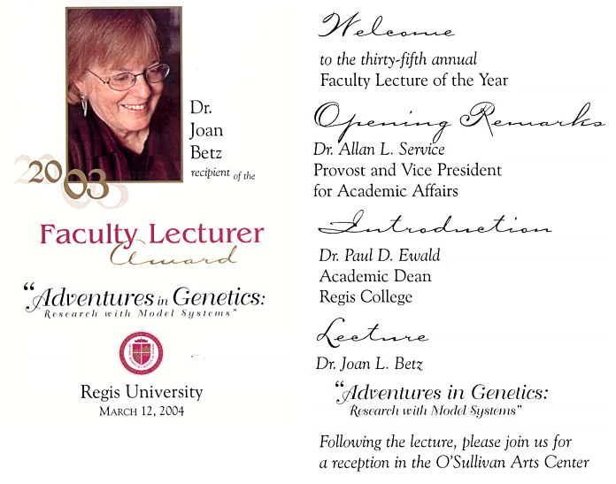 Her presentation, "Adventures in Genetics: Research with Model Systems," is a tale of one woman's personal and scientific journey. The lecture will highlight some of the people, places, and genetic research systems that have played significant roles during the career of Dr. Joan Betz.