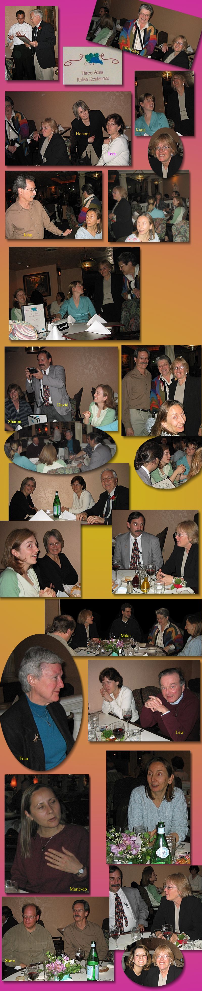 After the Reception, 16 of us gathered for dinner at a local restaurant. Guests included family (Joan, Bill, Emmy - Jen and Dan were out of town - sister Sharon, Dave Swartz), Regis colleagues (Marie-Do Franco and Mike Ghedotti), and friends (Katie Robb, Fran & Lew Pizer, Honora & John Caldwell, Kathryn Howell, Angie Ribera, Terri & Steve Fadul)