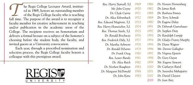 Joan Loveday earned her B.A. in Biology from Oberlin College in Ohio and, as Joan Loveday Betz, an M.S. in Microbiology from Yale University, a Ph.D. in Biochemistry from University College London, London, UK, and completed post-doctoral research in Molecular Biology at the University of Colorado Denver (UCD). She joined the Regis community in 1990, bringing expertise and equipment for molecular biology laboratories, and received Regis' first National Institutes of Health research grant. Dr. Betz teaches courses for both biology majors and non-science students, the Regis core freshman seminar, and diverse upper-division biology courses. She serves as Regis' pre-medical advisor, and is the chairperson of the Biology Department.