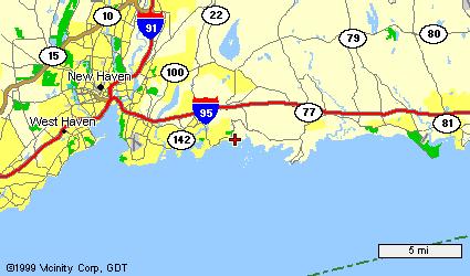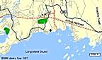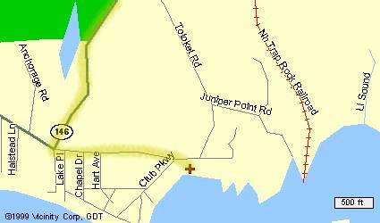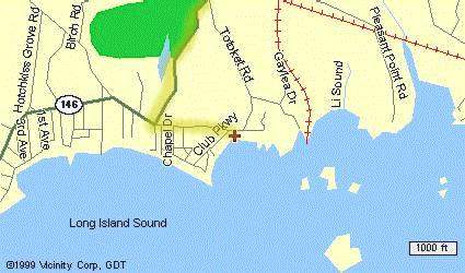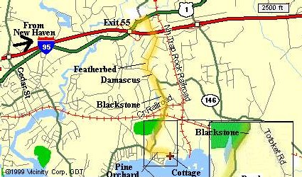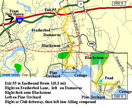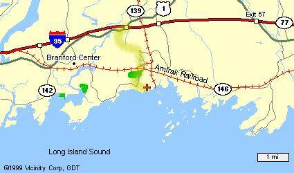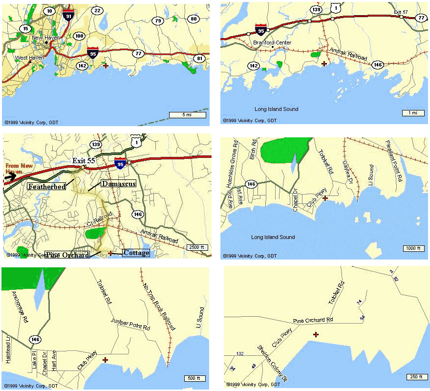 The cottage is east of New Haven, south of the town of Branford, right beside the clubhouse of the Pine Orchard Country Club. The six maps below show the location at increasingly fine resolution (click on any map to see an enlarged version).