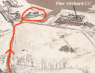 As you emerge into an open area, the Pine Orchard Club House will be on your right. Start to turn right towards the club house, then turn left right away into the driveway of the Alling compound (see aerial photo below).