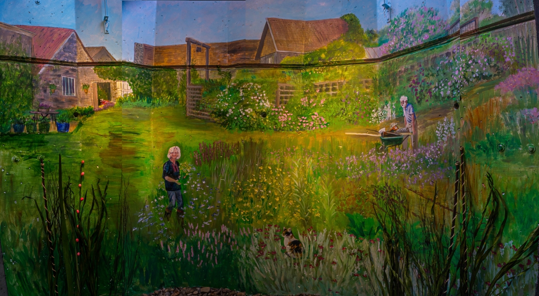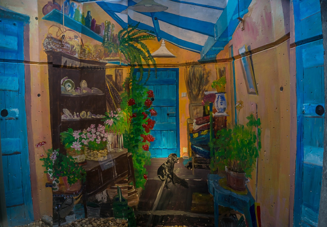 In 2016 Carol Tuttle returned to do two more window wells. She worked from pictures of Brockley, the verdant and pastoral farm in the West Country of England, where our friends Conny & Antony Ridge live (we four met in 1967 in New Haven), and where our family has visited many times over the decades. One mural shows the entry way to their house.