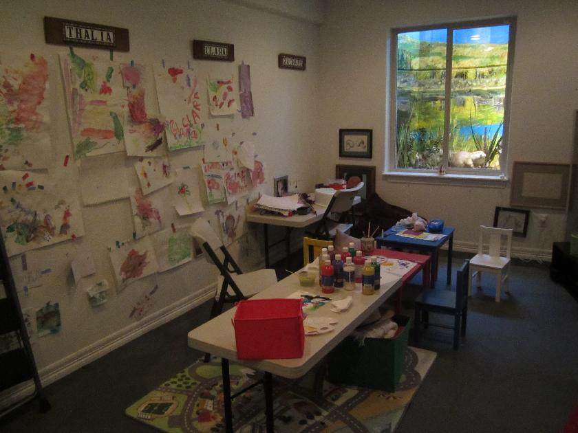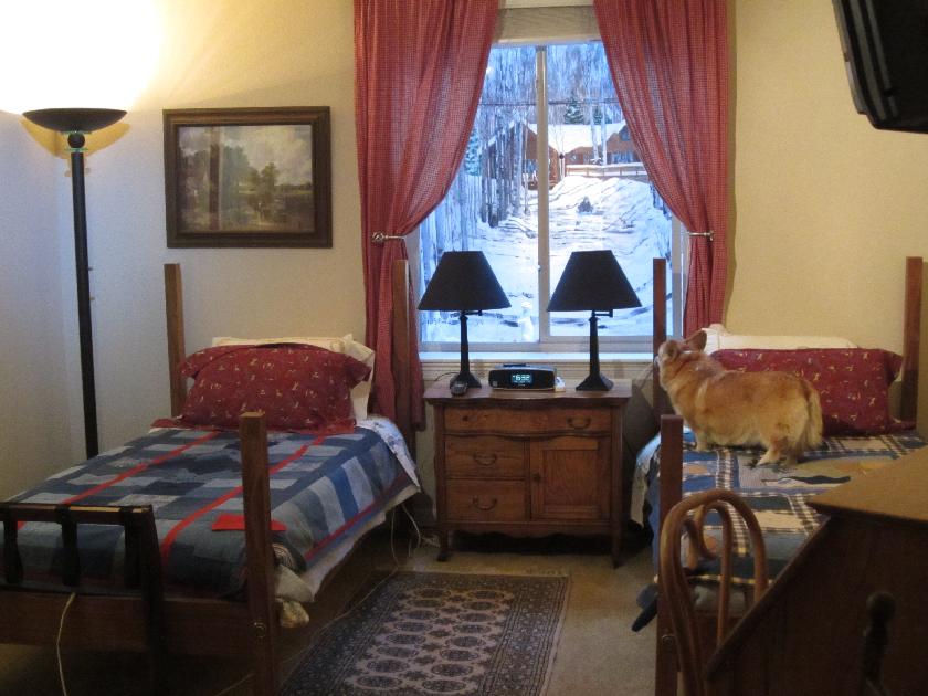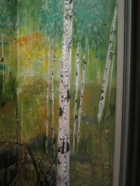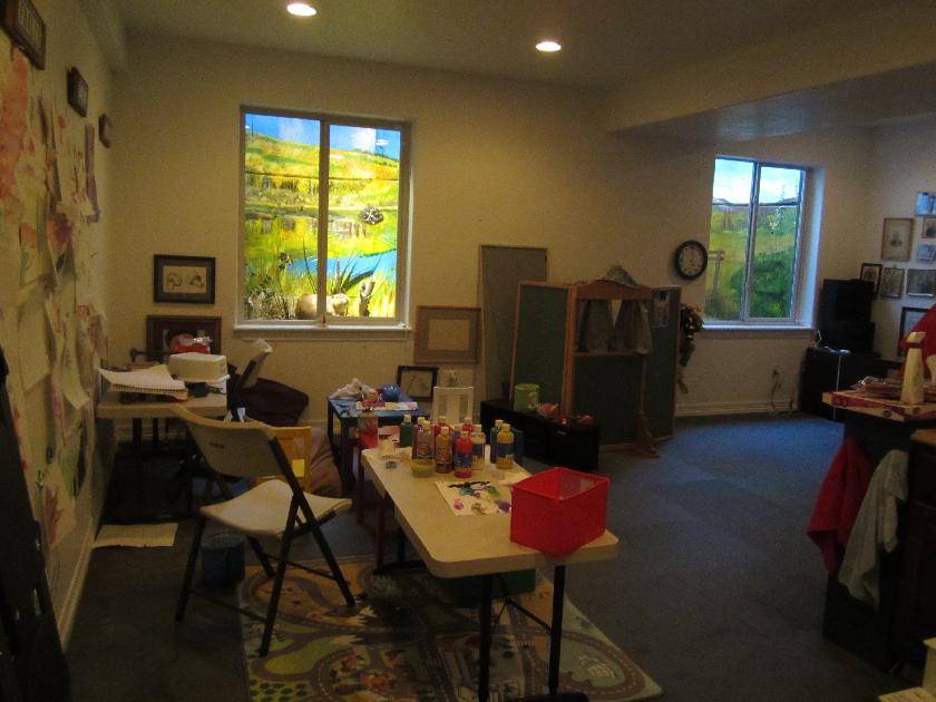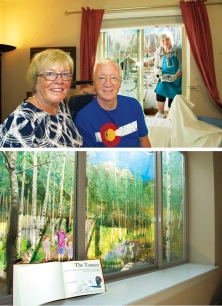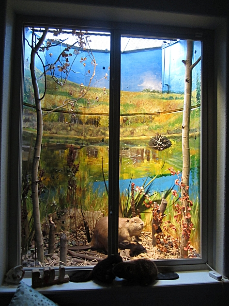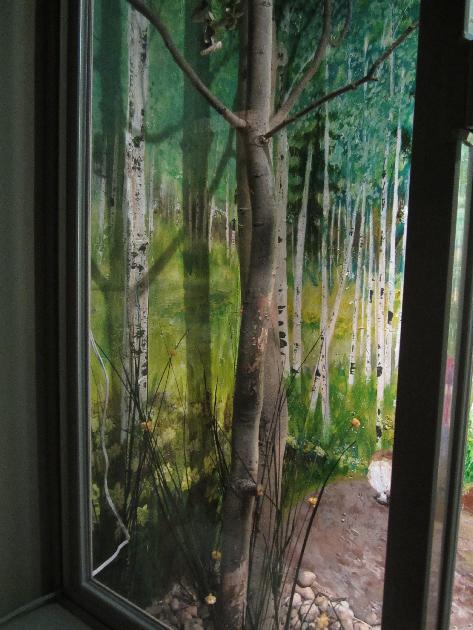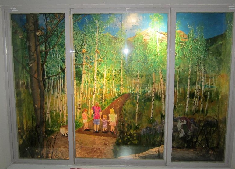 2.CRAFT/SEWING ROOM DETAILS of #2: Two murals in the craft/sewing room depict autumn and spring. The left hand window well shows our favorite beaver pond in autumn. The aspen leaves have turned golden. The beaver came from a Denver taxidermist who was retiring, and selling his stuff. ![]() The right hand window well in the craft/sewing room shows a springtime view from The Bench*, one of our favorite spots, overlooking the ranch meadow, with horses grazing, and the high peaks of the Gore Range still blanketed in deep snow. *The Bench was dedicated in 1990 in honor of our dear friend (now departed), Prof. Esther Doyle.