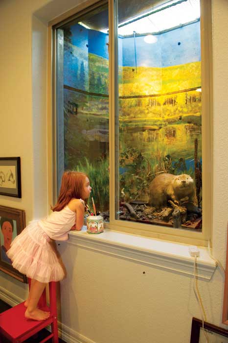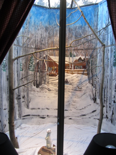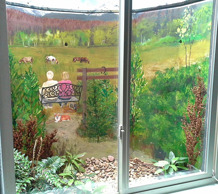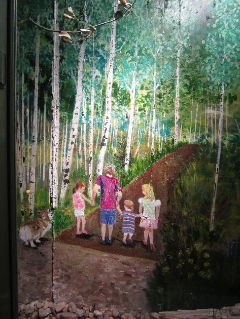 How to dress them up? If you google 'window well art,' you find several companies offering different scenes, printed on plastic, which can be inserted into a window well. They cost about $80. The selection, however, is pretty thin, and of course they cannot be customized in content. As described in the Front Porch article, we were inspired by a neighbor who had hired muralist Carol Tuttle to create three special scenes for window wells in their home. We hired Carol to dress up 4 of our window wells with scenes from the vicinity of our mountain cabin. Adding some items to the foreground turned the murals into dioramas. Lights make them visible night and day. Here are some pictures of our four window wells, in 3 rooms: 1. LIVING ROOM DETAIL OF #1. This depicts a summer scene, along the path leading from our cabin into the wilderness, with our grandchildren (l. to r.) Thalia Hoke, Zach Liptzin, Matilda Hoke, Clara Liptzin. Zippy the corgi is there, as is The Tomten (a favorite Scandanavian folk tale of our children). Keller Mountain is visible on the horizon.