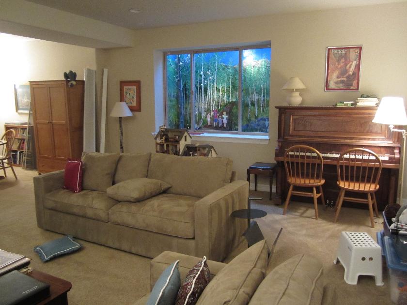 In 2012 we (Joan and Bill) moved 5 miles to Denver's new Stapleton neighborhood from Hilltop (where we lived for 40 years) to be closer to our daughters and their families, also Stapleton residents. In our former house, the basement was a traditional place that was not particularly well designed for everyday living. The basement in our new house, however, like many in Stapleton, is designed to be an integral part of the living space. The high ceilings in particular help dispel the undergroundness of the place. The windows, however, are not very helpful - the dreary gray concrete of the window wells is an instant reminder.