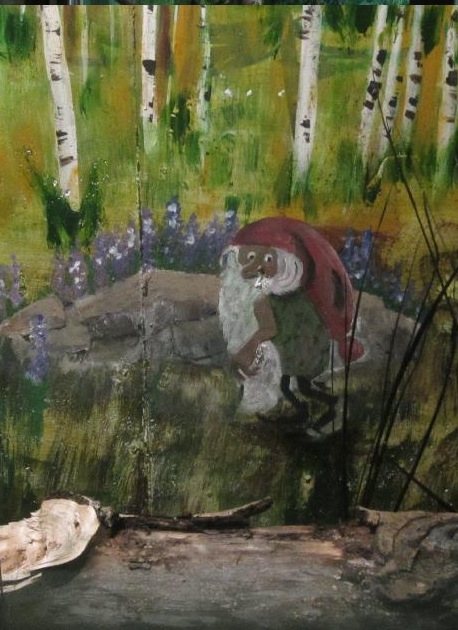 DETAILS of #1: left: We added some real aspen tree trunks to the diorama. right: The Tomten, from the book by Astrid Lundgren.